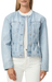 This classic collarless denim jacket is designed with a flattering seam detail that accentuates the waist. Isara comes in a light vintage-inspired wash with a five-button closure and double patch pockets. By Paige.
